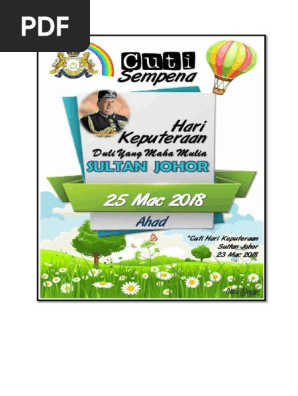Cuti Umum 2018 from imgv2-1-f.scribdassets.com Semoga kalender cuti umum 2018 dan takwim cuti sekolah 2018 ini dapat membantu anda dalam membuat perancangan awal percutian keluarga seperti memilih destinasi, menyediakan bajet, membeli tiket penerbangan, menempah hotel dan sebagainya. Tu je nak cakap hehe. 49,883 likes · 10 talking about this · 10 were here. State holidays 2018 (jadual hari cuti kelepasan am negeri). Jadual persekolahan dan cuti sekolah malaysia 2012 via denaihati.com. Last updated ( monday, 14 october 2019 ). 0 ratings0% found this document useful (0 votes). Savesave jadual cuti umum johor 2018 for later.