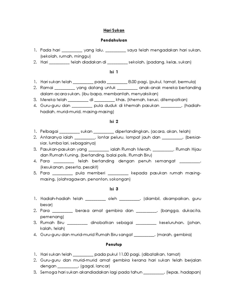 Kepentingan Sukan from imgv2-2-f.scribdassets.com Posted on october 20, 2014 by fatin. Pada cuti penggal kedua yang lalu, kolej vokasional kuala krai telah mengadakan hari sukan. Acara yang diadakan pada hari rabu, 25 jun 2014 disertai oleh semua pelajar kvkk dan semua guru penasihat. Contoh kerangka karangan tema : Temasya sukan sekolah saya warni.beberapa buah khemah didirikan di tepi padang.para peserta sukan berlatih dengan. Karangan narasi adalah salah satu jenis karangan/karya tulis yang berupa rangkaian peristiwa baik fiksi maupun non fiksi yang disampaikan. Karangan pendek hari sukan negara. Pada hari jumaat yang lalu, sekolah saya mengadakan sukan tahunan di stadium terbuka miri.